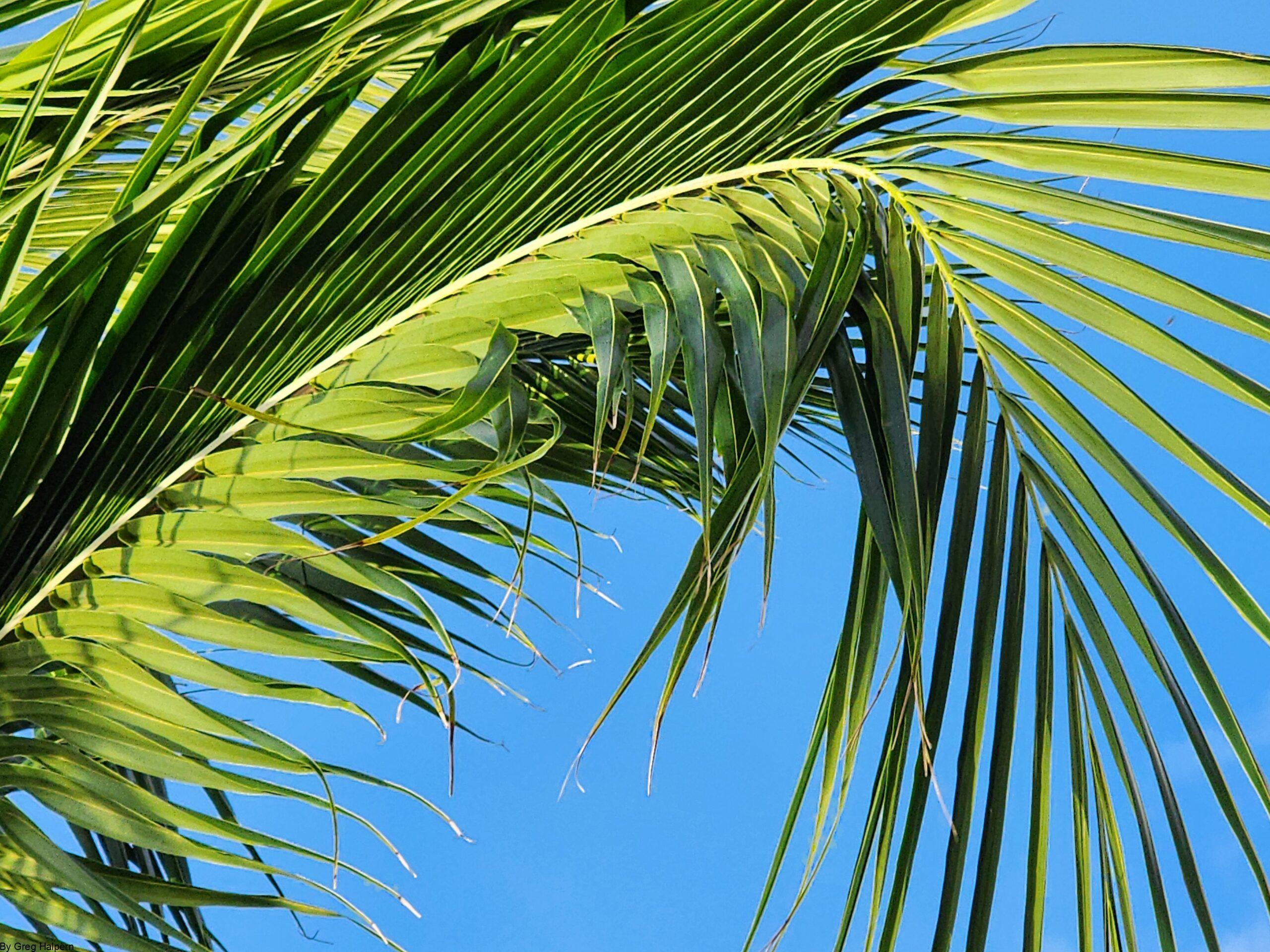 Palm fronds curve like a fountain, forming a tunnel of green leaves with blue sky beyond.